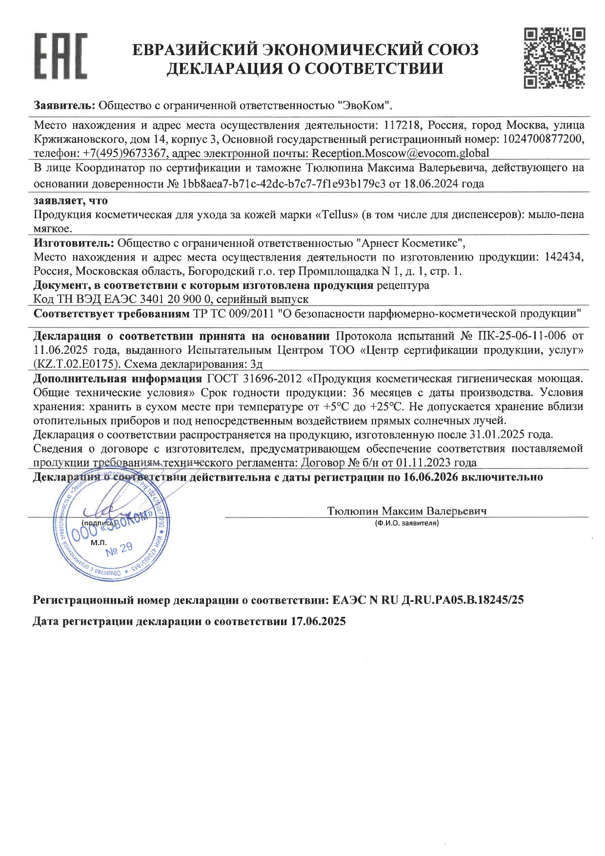Предложите посетителям мыло-пену со свежим ароматом, которое подходит для разных типов кожи. Жидкое мыло-пена Tellus мягкое содержит ряд экстрактов, которые стимулируют обновление и восстановление кожи, способствуют её питанию, увлажнению и смягчению. Специальный картридж образует мягкую кремовую пену для бережного мытья рук. Подходит для использования в диспенсерах для мыла-пены Tork. ПАВ, используемые в составе продукта, оказывают бережное очищающее действие во время мытья рук.